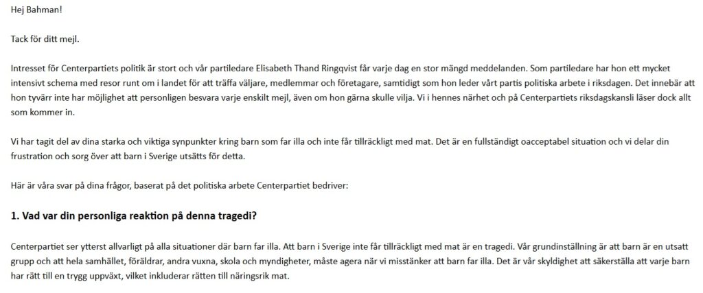 Detta svar skickades inte personligen av Elisabeth Thand Ringqvist, utan av Centerpartiets riksdagskansli.